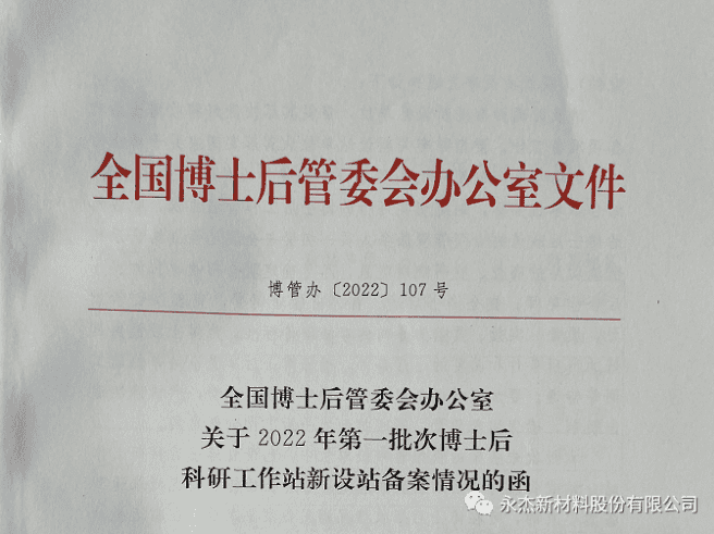 近日,全国博士后管理委员会办公室印发《关于2022年第一批次博士后科研工作站新设站备案情况的函》,永杰新材料股份有限公司获批设立国家级博士后科研工作站,标志着公司在优秀人才引进和创新人才平台建设方面迈上了新台阶。